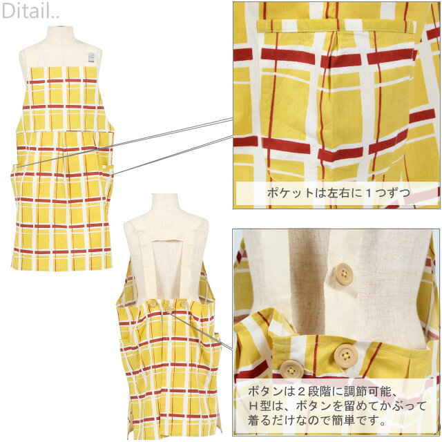 H型エプロンは肩紐がずれ落ちないので、動きやすく 後ろをボタンで留めて、かぶって着るだけなので、子供が一人で簡単に着れて 動きやすいと人気の型です。