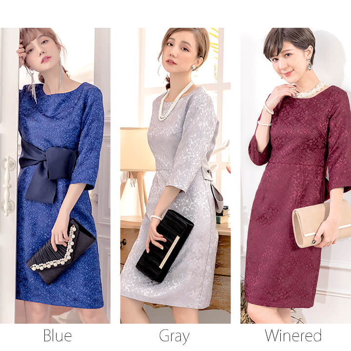 【クーポン利用で1976円】パーティードレス 結婚式 二次会 ワンピース ミニドレス フォーマル ドレス ミディアム 大きいサイズ 膝丈 膝下 ジャガード 演奏会 謝恩会 同窓会 女子会 パーティドレス 長袖 七部袖 袖あり 袖付きグレー 灰 ブルー 青 ワインレッド 赤 レディース