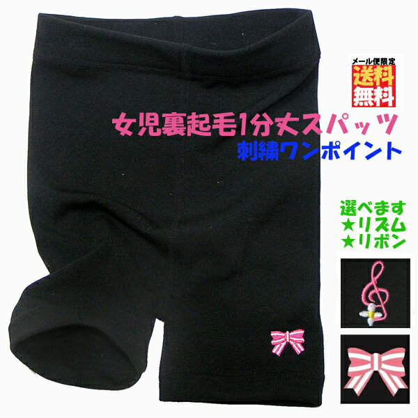 裏起毛 キッズ スパッツ 1分丈 ■ ジュニア レギンス 黒 女児 あたたかい ふんわり やわらか ■ リボン リズム 秋 冬 女の子 暖か 防寒 子ども ワンポイント刺繍 マイクロ起毛 ブラック 【メール便限定送料無料】