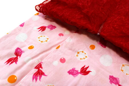 お仕立て上がり女の子浴衣と兵児帯の2点セット-No.002(金魚/各サイズ有り/浴衣地色:ほんわりピンク色/兵児帯:赤色/浴衣綿100%/兵児帯ナイロン100%)